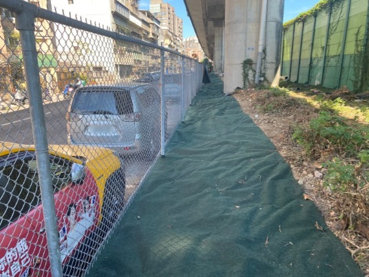 為了提供用路人安全的停車空間,這次在高速公路橋下,緊臨停車格旁的區域,清除雜草,整地後,鋪設2米寬的白茅防草絨,由於白茅防草絨具99.9%的高遮光率,也是徹底阻斷雜草生長機制的至要關鍵。而絨料厚達2mm,抗穿刺能力佳,這是専為抑制白茅等強勢雜草而設計,透氣透水鋪面,更友善環境。
