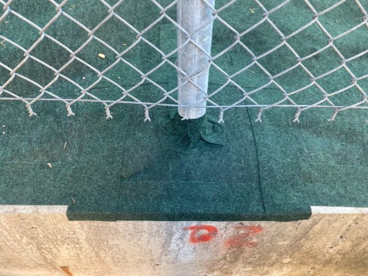 鋪設白茅防草絨,工法非常嚴謹,鋪設前,先清除雜草,平整施作範圍,才開始鋪設絨料,絨料以固定樁固定,長達200mm至250mm的固定樁,將絨料穩穩扎牢,不怕強風掀翻,並在任何搭接處,使用専用的防草膠布黏合,而絨料與結構收邊處以専用的黏著劑黏合,即使鐵網圍籬的柱子,也以絨料完整包覆黏合,這些嚴密的做工,無非是為了嚴防任何破口讓雜草伺機竄生的機會,才能還給用路人更安全清爽的停車空間。