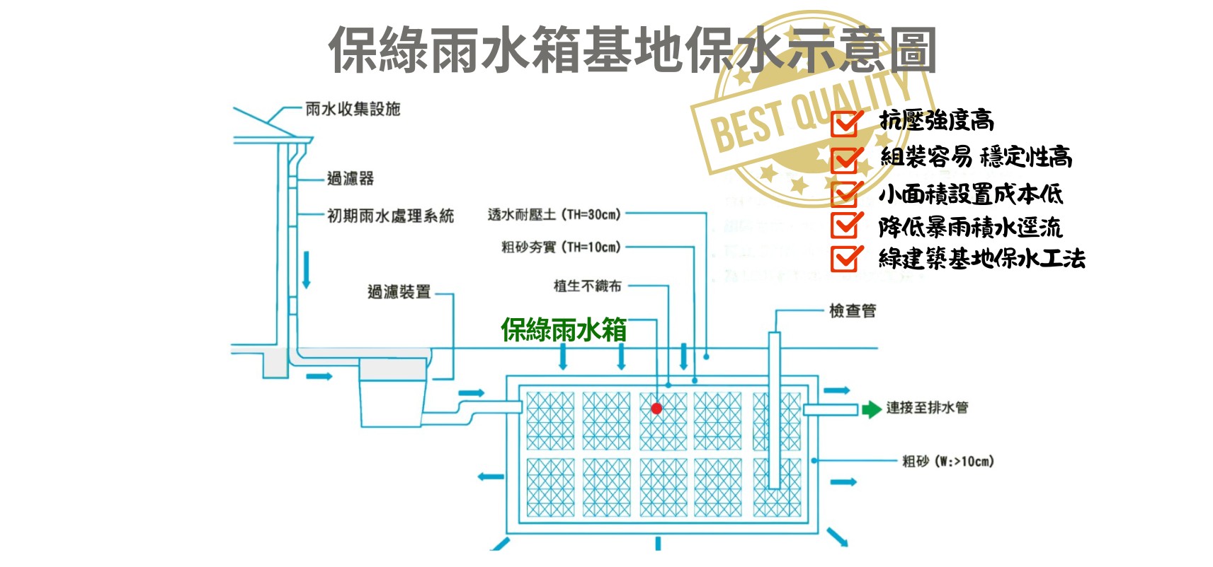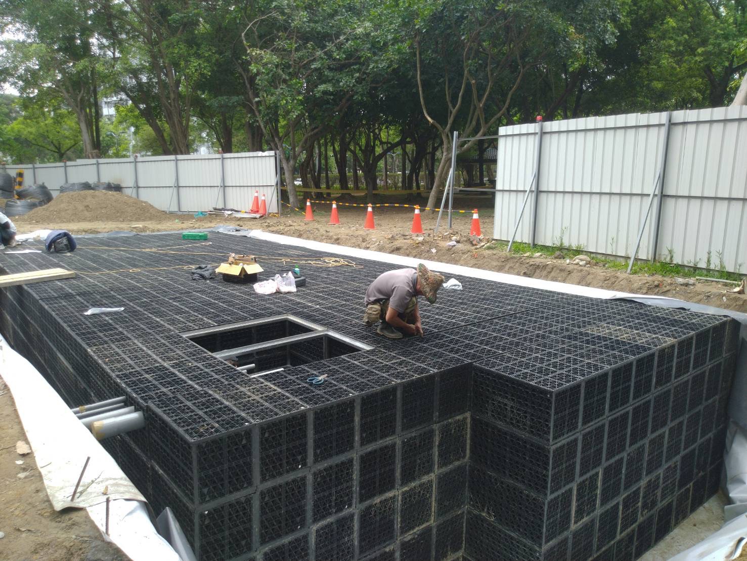 保綠雨水箱具抗壓強度,穩定性高,設置於地表下,作為地下滯洪池,相較於混泥土蓄水設施成本更低,而且組裝簡易,施工快速,針對不同案場,提供各種尺寸規格,保綠雨水箱還可以多層重疊組裝,增加內部隔板,提高抗壓強度。