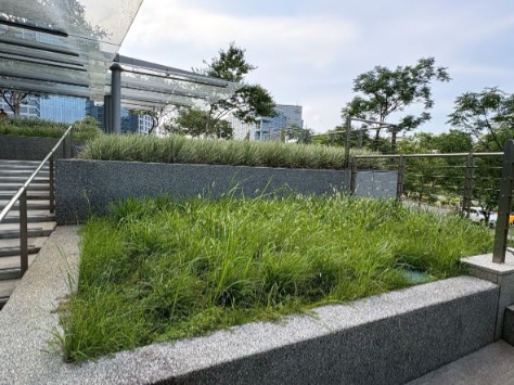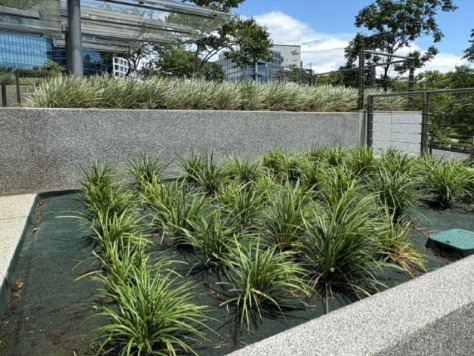新北遠東園區辦公大樓前的花台,麥門冬被白茅等強勢雜草攻略,幾乎覆沒。