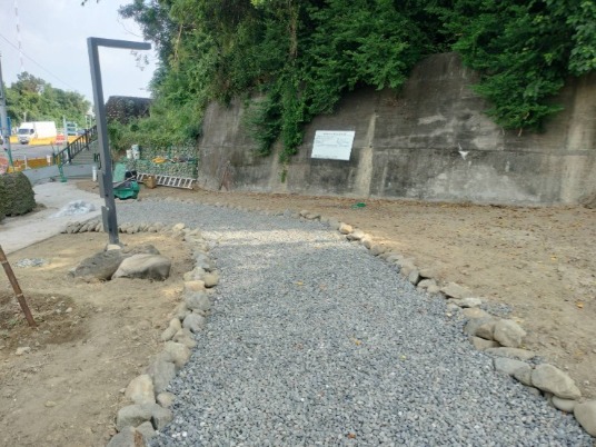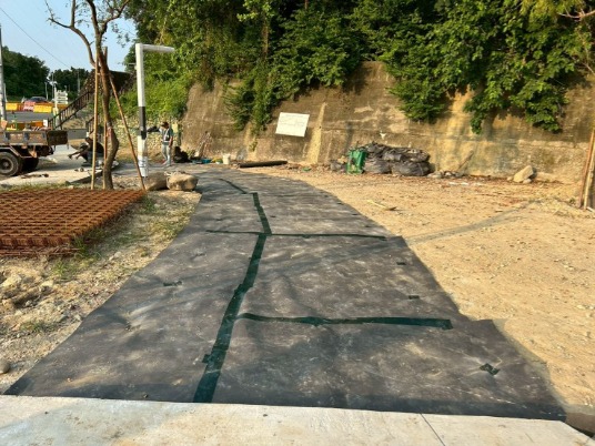 STEP1: 高雄興建中的公園步道,在礫石堆下,鋪設植生防根布,加強防護。