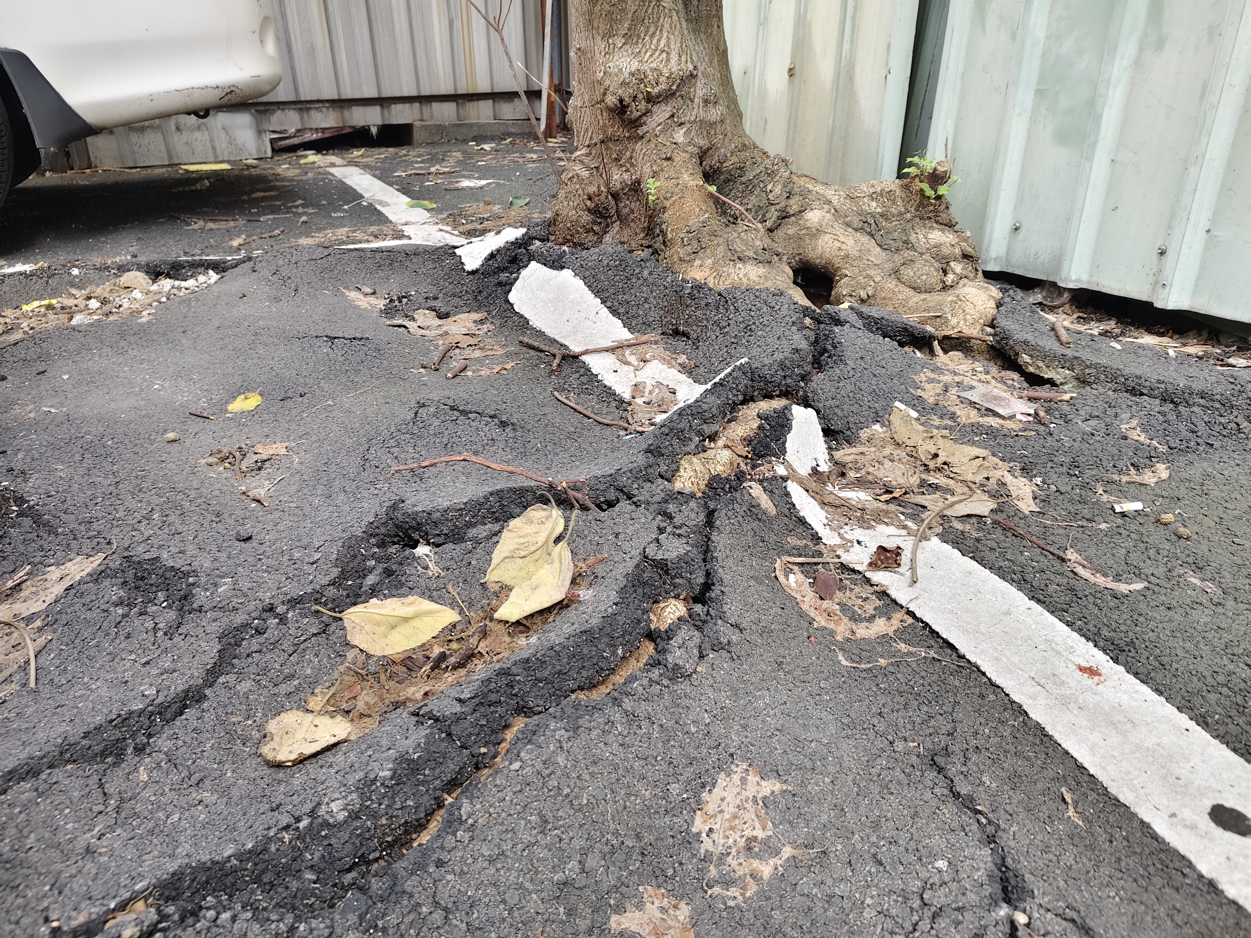 其實浮根是樹根求救的警訊。往往因為樹穴空間太小,土壤反覆經過人車重壓、被夯實,土壤不透氣、不透水,根系迫於生存,只好向上伸展,浮出地表的樹根,無法支撐龐大樹冠重量,頭重腳輕,時間久了,容易增加倒伏的風險。