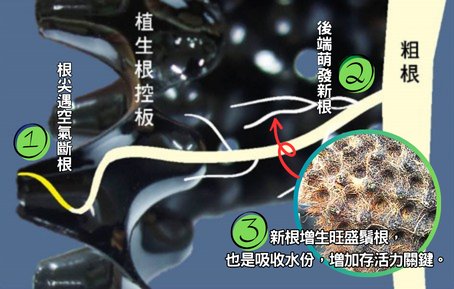當根尖停止生長,刺激後端萌發出2至3根新生根系,新根系前端也是吸收水份和養份效率最高的地方,依此反覆循環,培養大量的新生根系,不但可以幫助樹木定植後,快速汲取養份,還可抓住土壤,鞏固根球的完整性,提高定植後存活率。