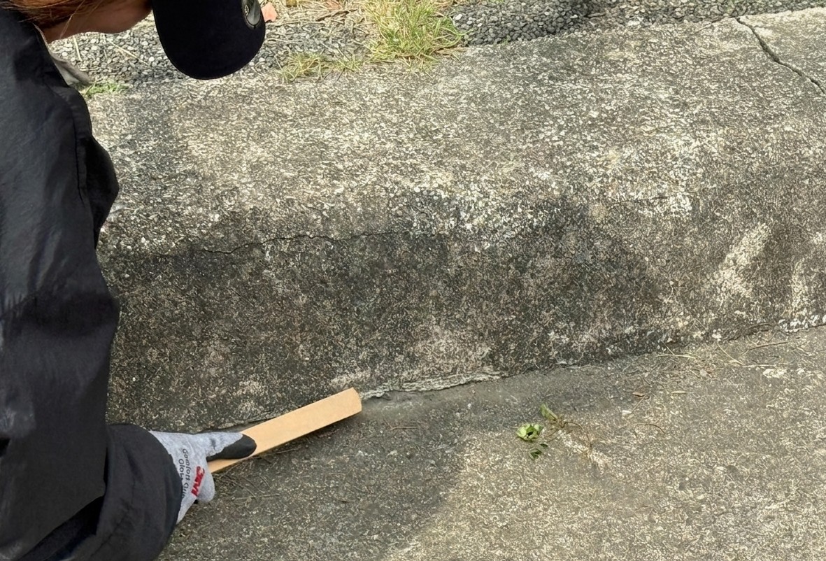 新建縫隙防草條像一般膠帶,撕開背膠就可以黏貼於施作區域上。若有搭接處至少重疊5cm以上。