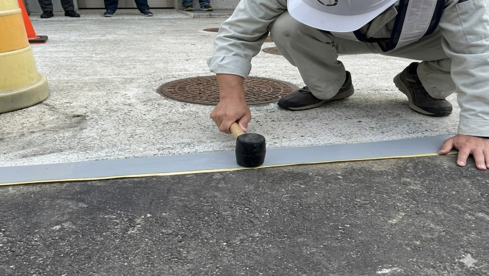 黏完膠帶以後,再以橡膠槌敲打黏貼處,讓膠帶與施作面更密切黏合即可。