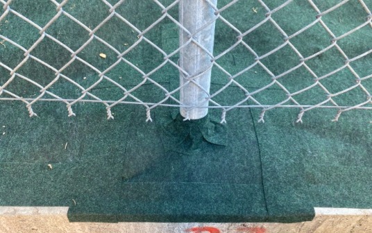 另在任何搭接處,使用専用的防草膠布黏合,而絨料與結構收邊處以専用的黏著劑黏合,就連鐵網圍籬的柱子也不放過,以絨料完整包覆黏合,這些嚴密的做工,無非是為了嚴防任何破口讓雜草伺機竄生的機會。