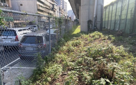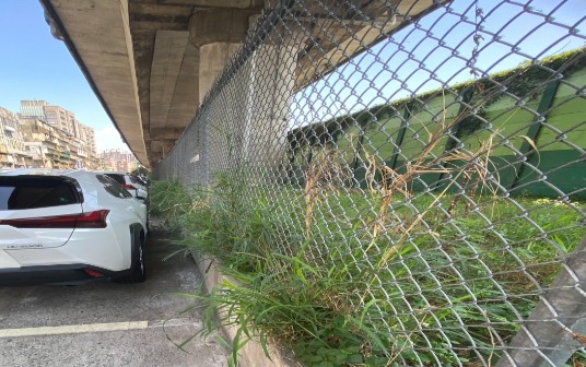 高速公路東湖段橋下,雜草、雜木叢生,有些枝幹甚至竄出鐵網,因為旁邊緊臨停車格,特別是夜晚、或是雨天視線不佳時,不僅阻礙通行,也可能影響停車安全。
