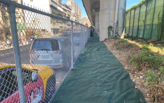 為了提供用路人安全的停車空間,這次在高速公路橋下,臨近停車格旁的區域,鋪設2米寬的白茅防草絨,具99.9%的高遮光率,也是阻斷雜草生長機制的至要關鍵。而絨料厚達2mm,這是専為抑制白茅等強勢雜草而設計,透氣透水鋪面,抗穿刺能力佳,更友善環境。